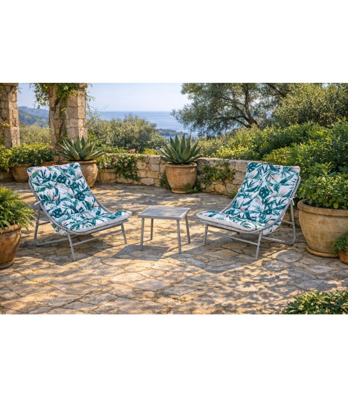 Φέρτε την τροπική ατμόσφαιρα στη βεράντα σας με το σαλόνι κήπου relax 3 τεμαχίων με σχέδιο φύλλα. Το ιδανικό καλοκαιρινό καθιστικό για όσους θέλουν να δώσουν χρώμα και ζωντάνια στον εξωτερικό τους χώρο.