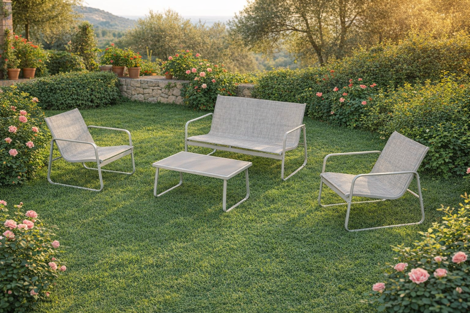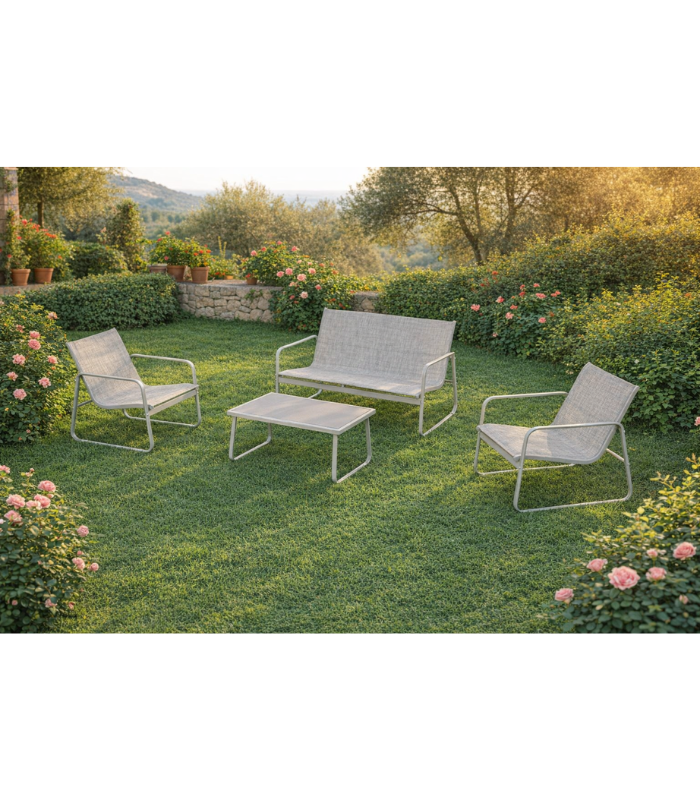 Το σαλόνι κήπου 4 τεμαχίων με textilene σε ανοιχτό γκρι είναι η ιδανική επιλογή για όσους αναζητούν έπιπλα εξωτερικού χώρου που συνδυάζουν αντοχή, λειτουργικότητα και κομψή εμφάνιση. Κατάλληλο για βεράντα, κήπο, αυλή ή rooftop.