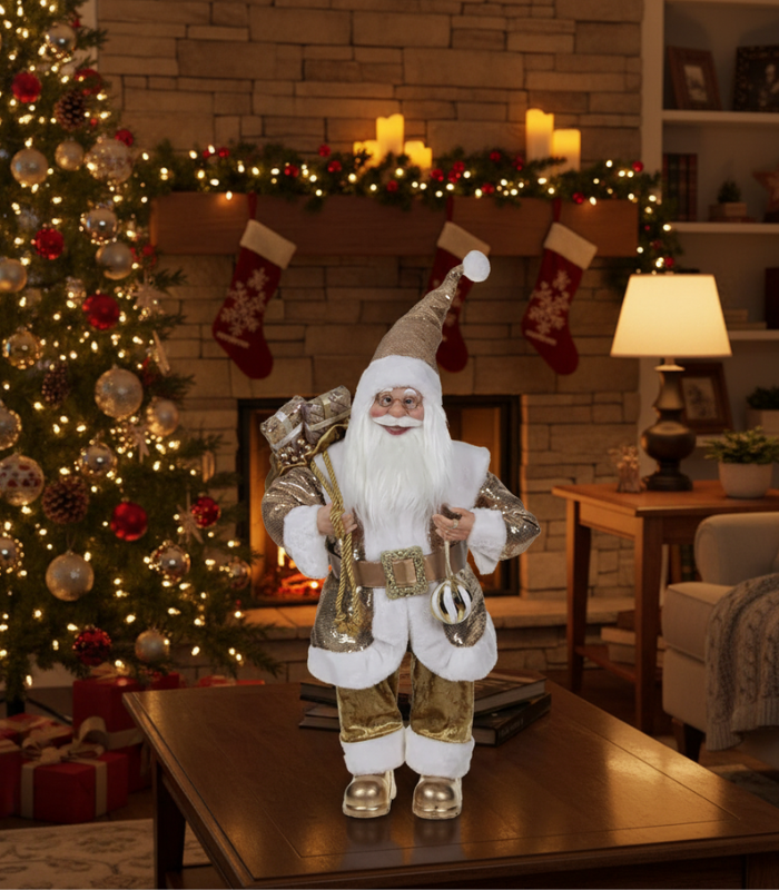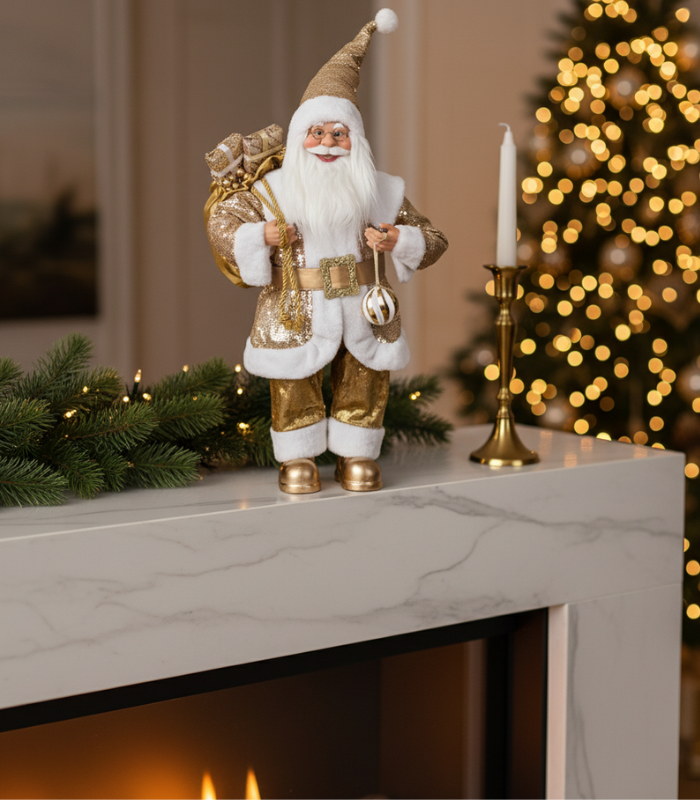 Ο διακοσμητικός Άγιος Βασίλης με χρυσή παγέτα δίνει στον χώρο έντονη, λαμπερή χριστουγεννιάτικη εικόνα.