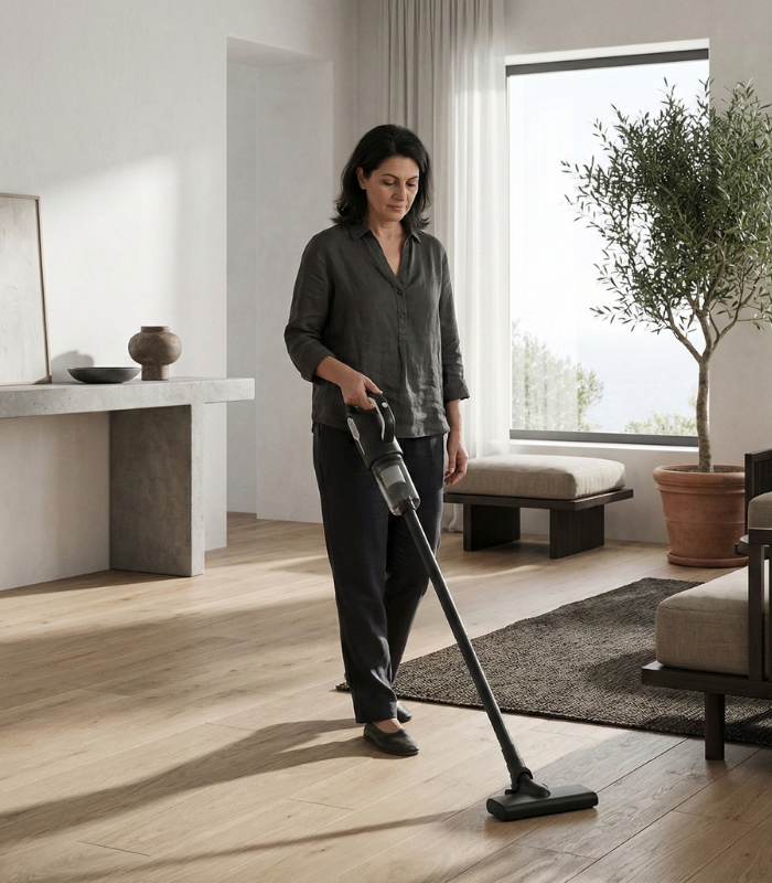 Η σκούπα είναι ελαφριά, εργονομική και κάθετη, για να φτάνεις εύκολα παντού και να καθαρίζεις γρήγορα χωρίς να κουράζεσαι.