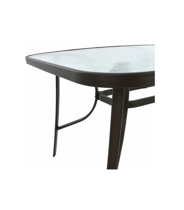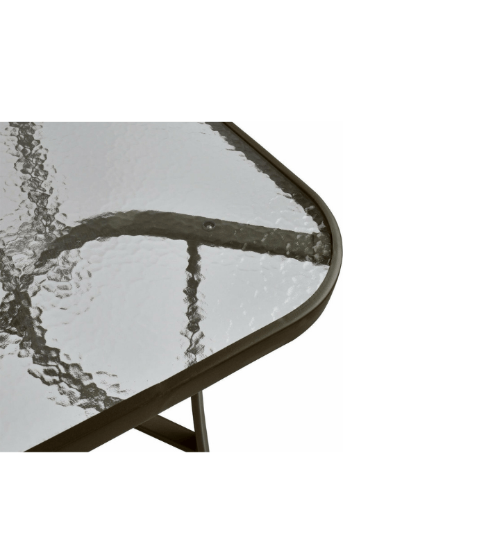 Τραπέζι εξωτερικού χώρου, κατασκευασμένο από μεταλλικό σκελετό, για μεγαλύτερη στιβαρότητα και ανθεκτικότητα, και γυάλινη επιφάνεια με τζάμι ασφαλείας, για μεγαλύτερη προστασία σε τυχόν θρυμματισμό του. Επιπλέον, το γυαλί της επιφάνειας έχει σχεδιασμό με κυμματιστά νερά.