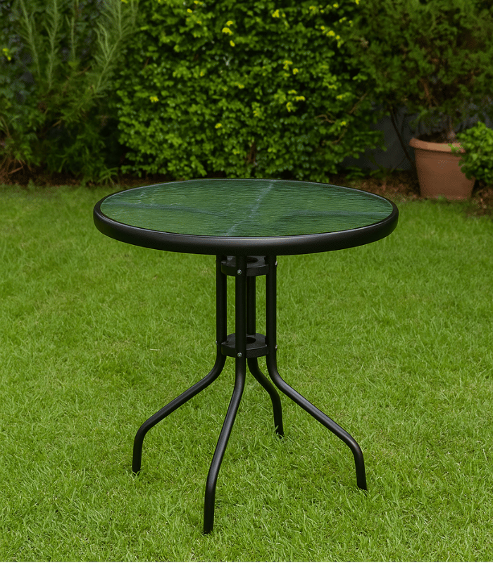 Κομψό και ανθεκτικό στρογγυλό τραπέζι με μεταλλική κατασκευή και επιφάνεια από τζάμι, ιδανικό για μπαλκόνι, αυλή ή κήπο.