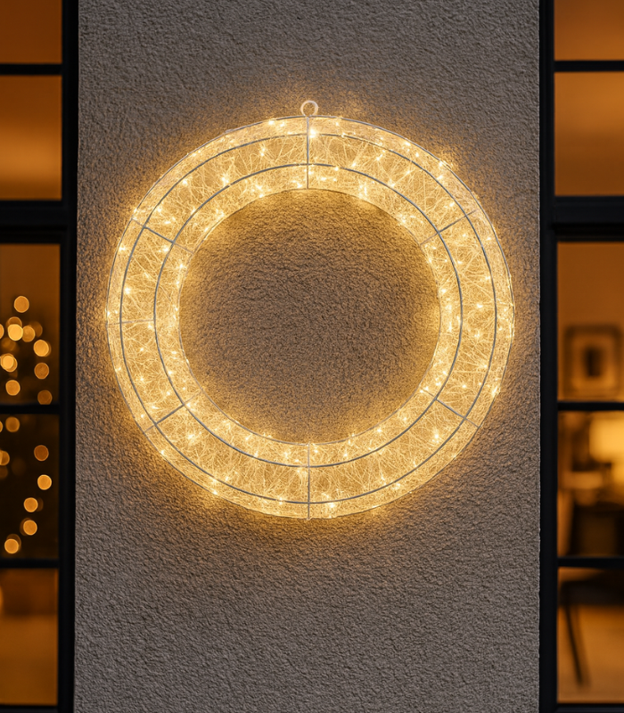Το τρισδιάστατο ακρυλικό στεφάνι LED σε λευκό χρώμα δίνει στον χώρο καθαρή και κομψή χριστουγεννιάτικη λάμψη. Η ακρυλική κατασκευή δημιουργεί σταθερό σκελετό και κρατά τα LED σε ομοιόμορφη κυκλική διάταξη.